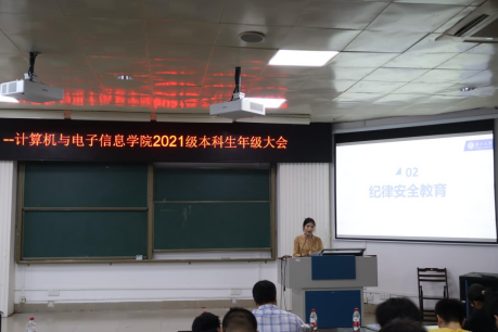 2021级本科生年级大会在学院214报告厅召开。学院党委副书记邓珍琪老师,2021级全体本科生、班主任及辅导员、教学办老师共400余人参加。会议由2021级带班辅导员张星月老师主持。