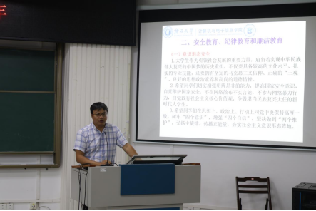 会议第二项议程,由学院党委副书记邓珍琪老师作年级学业情况分析以及安全教育、纪律教育和廉洁教育。邓老师从学业成绩、各班补考和重修情况等方面做了详细分析。他指出,优良的学风是提高教育教学质量的根本保证,是学生工作的核心部分,更是每一位学生的根本任务。同时,邓老师用身边实例,提醒同学们防诈骗、防偷盗、防火防电、防交通事故,注意人身安全、财产安全、个人信息安全,切实提升同学们的安全防范意识,引导同学们树立操守意识、规矩意识、纪律观念、底线思维,将安全牢记于心,为推动平安、文明、和谐校园建设贡献青春力量。