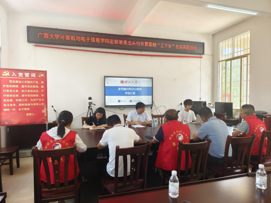 2024年7月15日下午,实践团一行来到广西百色市那坡县念头村进行调研。首先,团队成员在念头村党群服务中心与念头村村委会交流座谈,会上,学院乡村振兴“积分制”小程序开发小组成员梅松同学汇报了小程序进展情况及遇到的问题,村委工作人员对小程序投入使用提出改进建议。小程序计划于今年9月份在念头村开始上线使用,并计划在那坡县全县推广使用。随后,实践团一行在69书吧