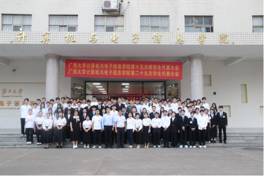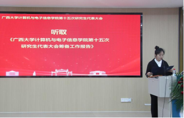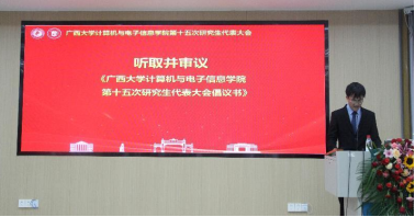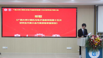 第十五次研究生代表大会在学院214报告厅召开。学院党委副书记邓珍琪老师、学院团委书记杨洋老师、学院研究生办公室秘书胡亮青老师、学院研究生会秘书长张星月老师,学院辅导员黄柏雄老师、林文潮老师、魏艳艳老师和龙紫璐老师,以及校研究生会执行主席覃湘怡同学和各兄弟学院研究生会代表出席本次大会。