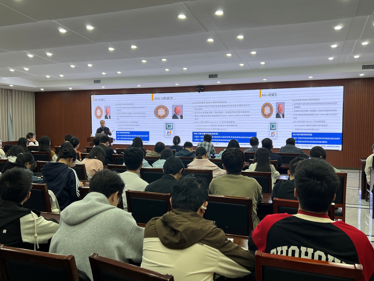 在此背景下,谢涛院士重点介绍了开放指令集架构 RISC-V 的破局潜力。他指出,RISC-V 凭借 “开放开源、灵活可定制” 的核心优势,不仅能降低芯片设计门槛,更能依托快速发展的开源软件生态,实现算力资源的共享共建,为国产 AI 算力突破提供了创新路径。从技术原理到产业落地案例,从生态构建逻辑到国际合作趋势,谢涛院士的讲解层层递进,让在场师生对 RISC-V 的战略价值有了更深刻的理解。