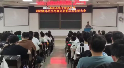 在214报告厅,组织召开2022级本科生年级大会暨征兵宣讲大会。学院党委副书记邓珍琪老师、校武装部陈榕平老师、学院辅导员庞承业老师和李易明老师、学院教学秘书甘瑜萍老师和罗程老师、电信233班班主任常侃老师以及学院2022级全体本科生参加会议。