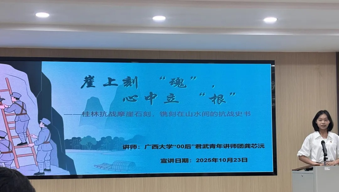 龚芯沅同学从中国人民抗日战争暨世界反法西斯战争胜利80周年这一历史节点出发,带领大家重温镌刻在桂林山水间的红色印记——摩崖石刻。通过“凿穿恐惧的呐喊”、“凿不灭的文脉”、“凿能传承的志气”三个篇章,她带领同学们走近那段峥嵘岁月,感悟崖壁上刻下的民族魂。