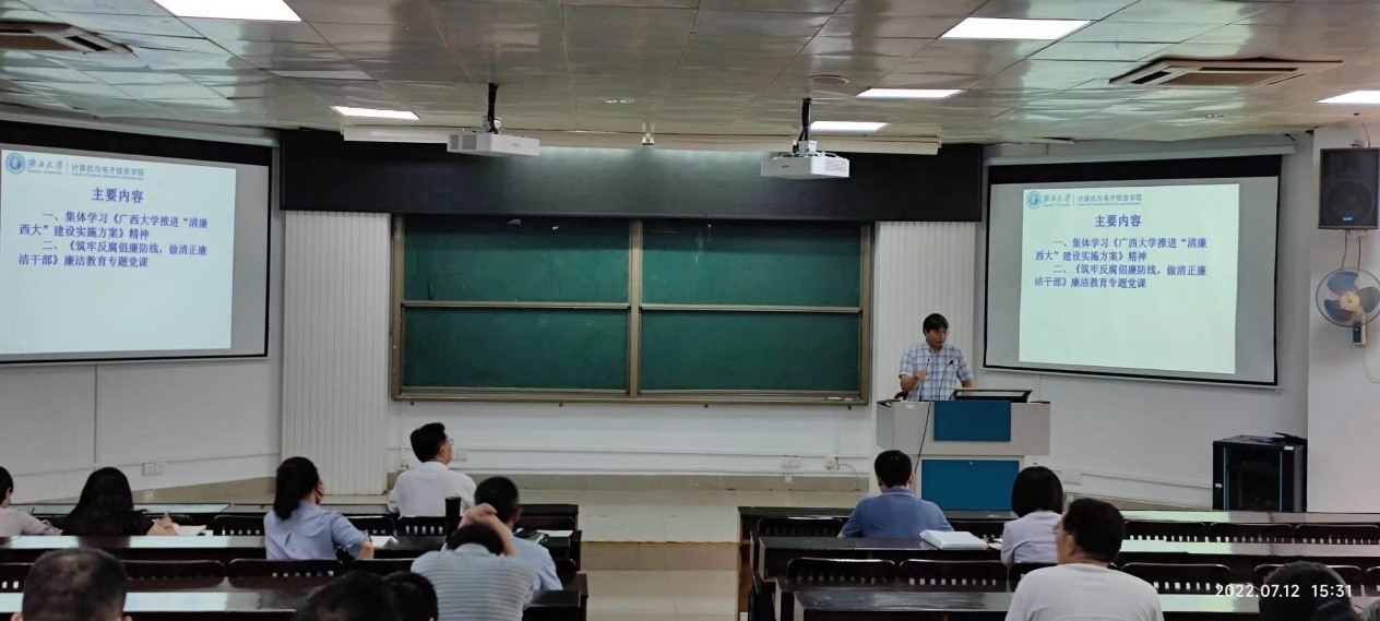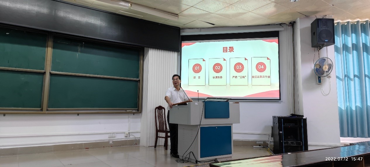 推进“清廉西大”建设实施方案》精神;然后邓珍琪同志为全体教职工作题为《筑牢反腐倡廉防线,做清正廉洁干部》廉洁教育专题党课;最后学院党委书记钟诚同志强调要求全体教职工必须高度重视廉洁教育,要将廉洁廉政教育与课程思政有机结合,做到让廉洁文化深入师生心中、廉洁理念成为共识、廉洁自律意识时刻牢记。