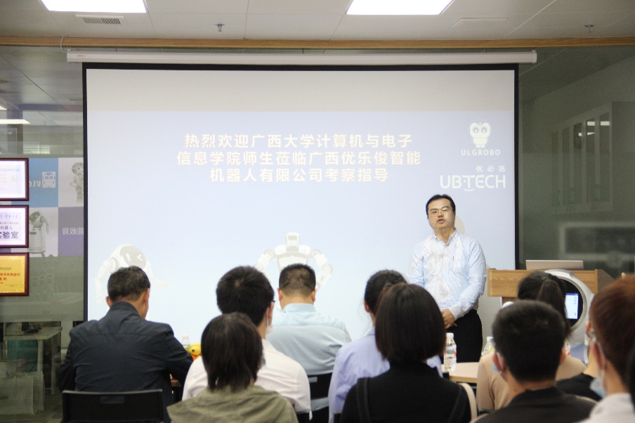 接着,广西优乐俊智能机器人有限公司CEO刘兴凯详细介绍公司的情况:广西优乐俊智能机器人有限公司是人工智能和人形机器人研发、制造和销售为一体的知名的深圳市优必选科技股份有限公司的广西总代理,主要为优必选机器人产品本地化服务。同时还展示了集控机器人Alpha、大型仿人机器人WALKER、教育机器人YanShee的主要功能和作用。