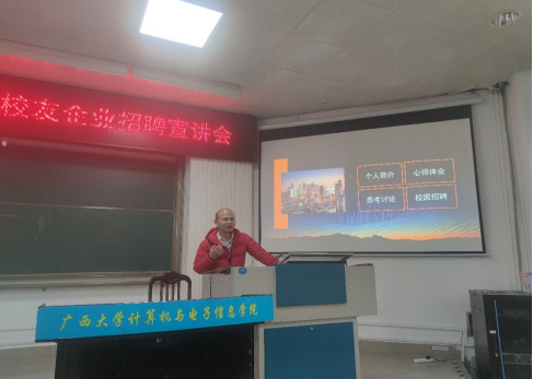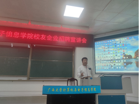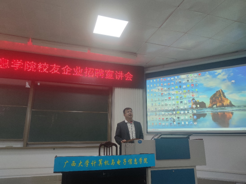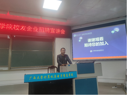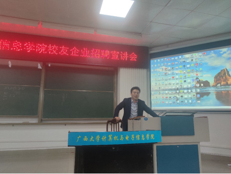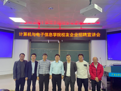 与校友企业合作,在学院214报告厅召开校友企业招聘宣讲会,校友企业广西尚信品科技有限公司、广西迅驰信息科技有限公司、广西优乐俊智能机器人有限公司和广西码农信息科技有限公司、以及广西天海信息科技有限公司等5家企业到学院开展2022届毕业生招聘宣讲。