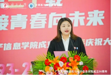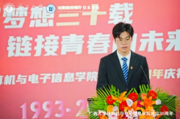 Junru Chu, a 2019 undergraduate student majoring in Information Security and a volunteer of the 25th Graduate Teaching Support Team of Guangxi University, gave a speech, sincerely wishing the college a happy 30th birthday, eternal youth, and greater glory.